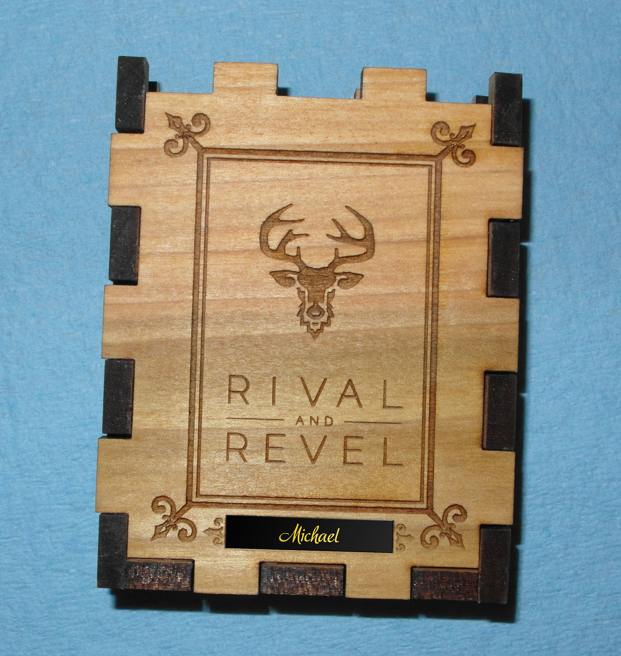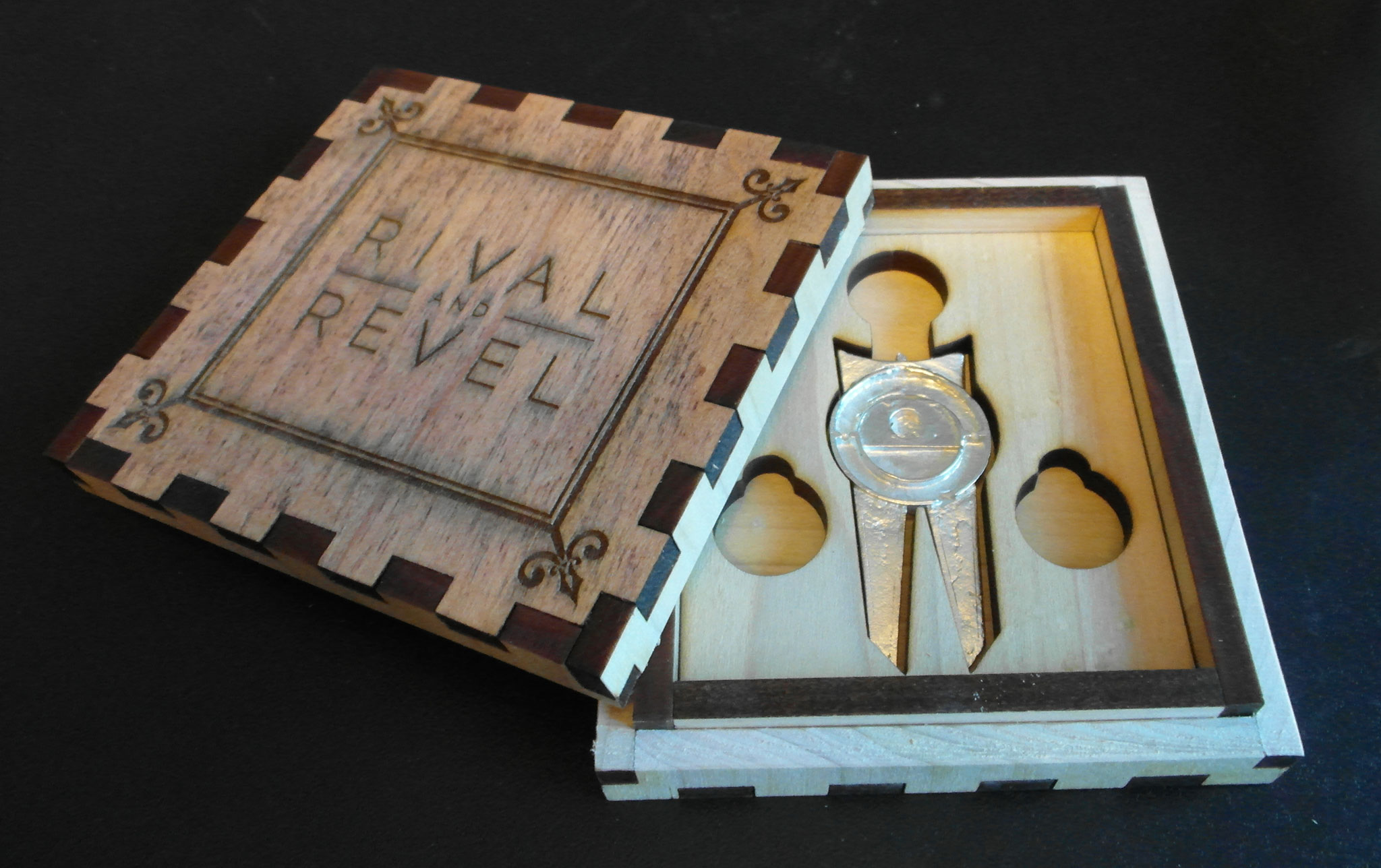 The final product included a custom wooden box that was laser cut and engraved, along with a caster pewter repair tool and three pewter markers.